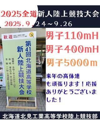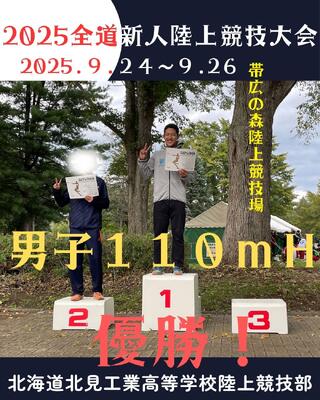 9月24日(水)~26日(金)に全道新人陸上競技大会が帯広市にて開催され、本校陸上競技部が参加しました。結果は男子110mHで優勝することができました!その他にも男子400mHと男子5000mにも出場し、各種目で入賞することはできませんでしたが、自分自身が持てる精一杯の力を発揮することができました。来年のインターハイ予選も帯広市で開催されるため、さらに力をつけて戻ってきたいと思います。来年度も優勝又は入賞を目指し、さらに練習に励みます!応援していただいた皆様、ありがとうございました!