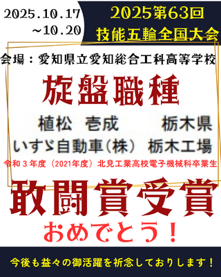 令和3年度(2021年度)に本校電子機械科を卒業した植松さんが技能五輪全国大会の旋盤部門で敢闘賞を受賞しました。技能五輪全国大会は、国内の青年技能者(原則23歳以下)を対象に実施されており、国際大会にもつながる大きな大会です。植松さんは今年で最後の出場となりましたが、様々な方々の支えのお陰で受賞することができました。これからも、北工卒業生の御活躍を応援しています!また、技術者として活躍する先輩を見習い、在校生も頑張っていきます!