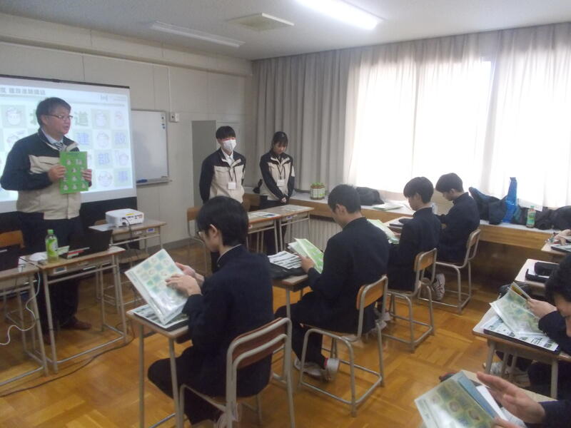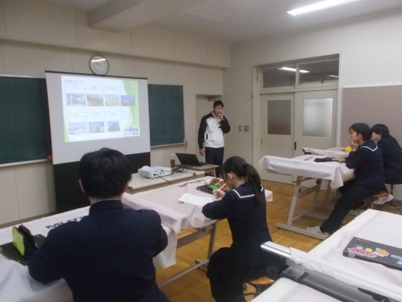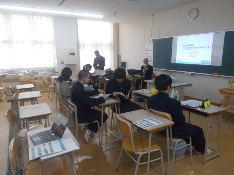 来年度から始まる、進路活動に向けて幅広い視野を持ってもらうため、オホーツク二建会様、北海道開発局網走開発建設部様、北海道オホーツク総合振興局様をお招きし、土木・建築の民間企業・公務員の仕事内容を教えていただきました。