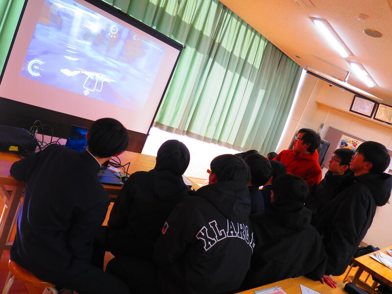 ドローンのシュミレーターではTVゲームになっており、実際にドローンの操縦を練習することができました。体験を行い、ゲームという1番身近な物でもあるため、生徒全員が盛り上がって行っていました。